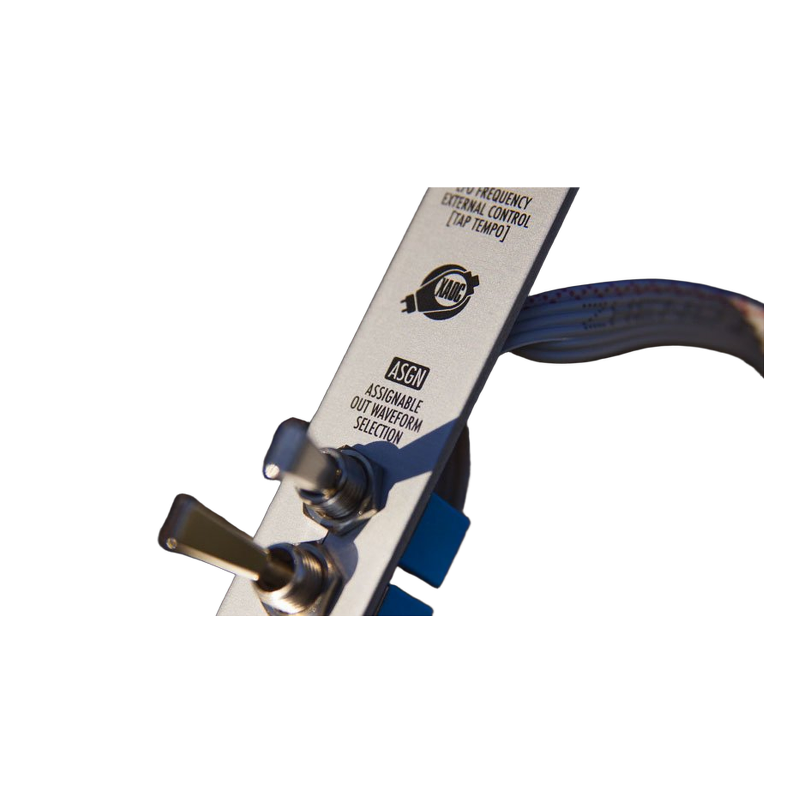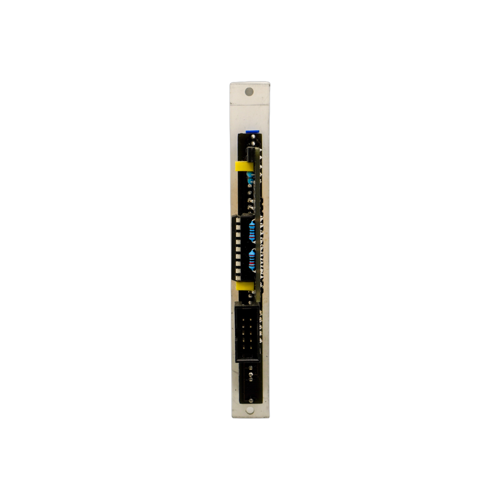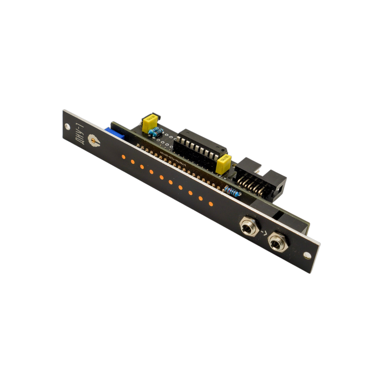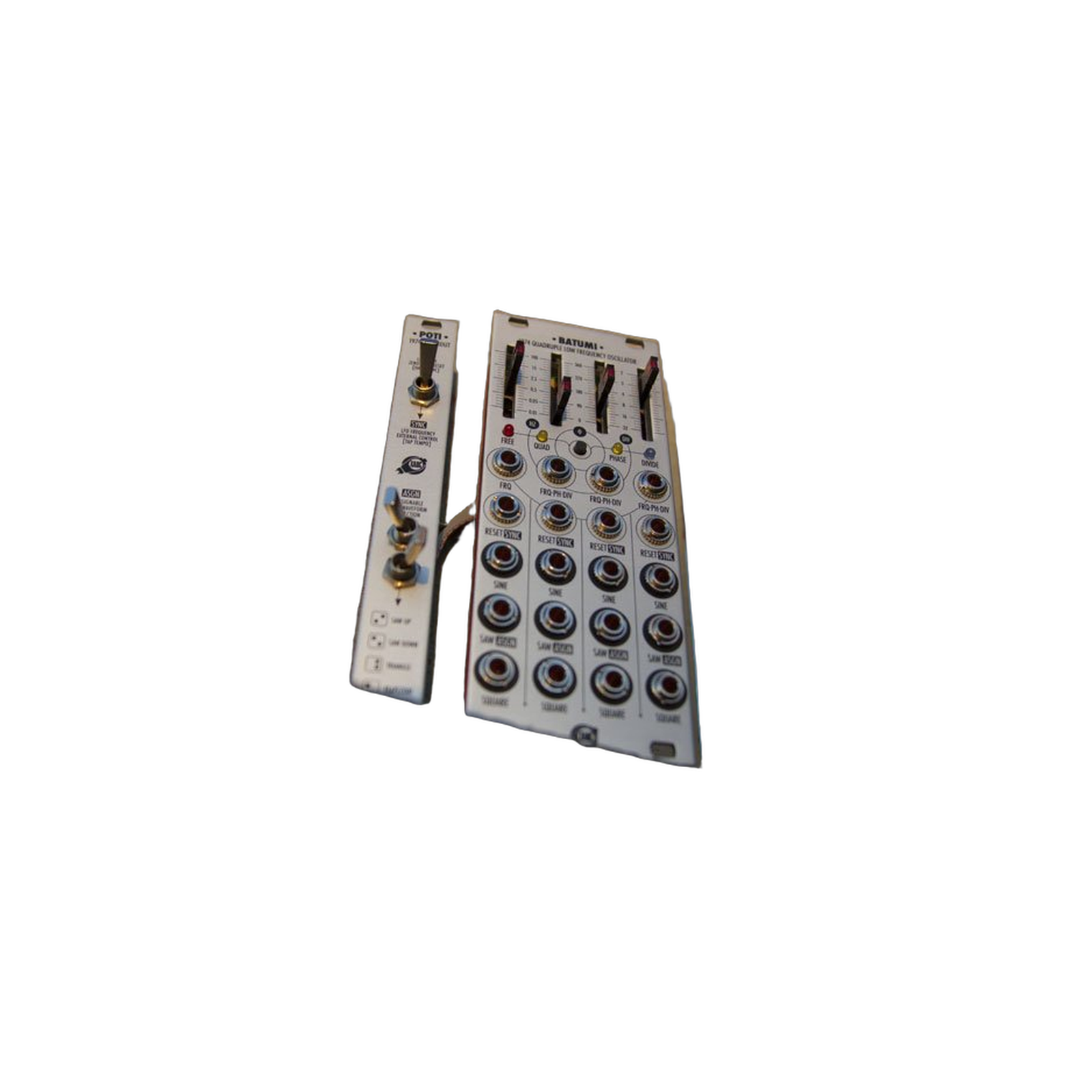 Poti is a simple but very useful breakout expander for the Batumi quadruple LFO module by Xaoc Devices. Its panel provides an immediate access to the Batumi functions originally selected by the cluster of jumpers on the back of the module: Reset/Sync mode option and selection of the assignable waveform.